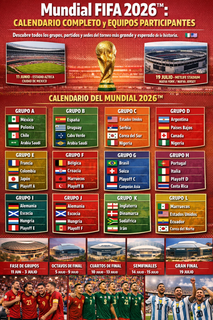 Del 11 de junio al 19 de julio de 2026, la Copa Mundial reunirá a 48 selecciones en EE. UU., México y Canadá. Descubre todos los partidos, grupos y sedes de la fase de grupos y eliminatorias.