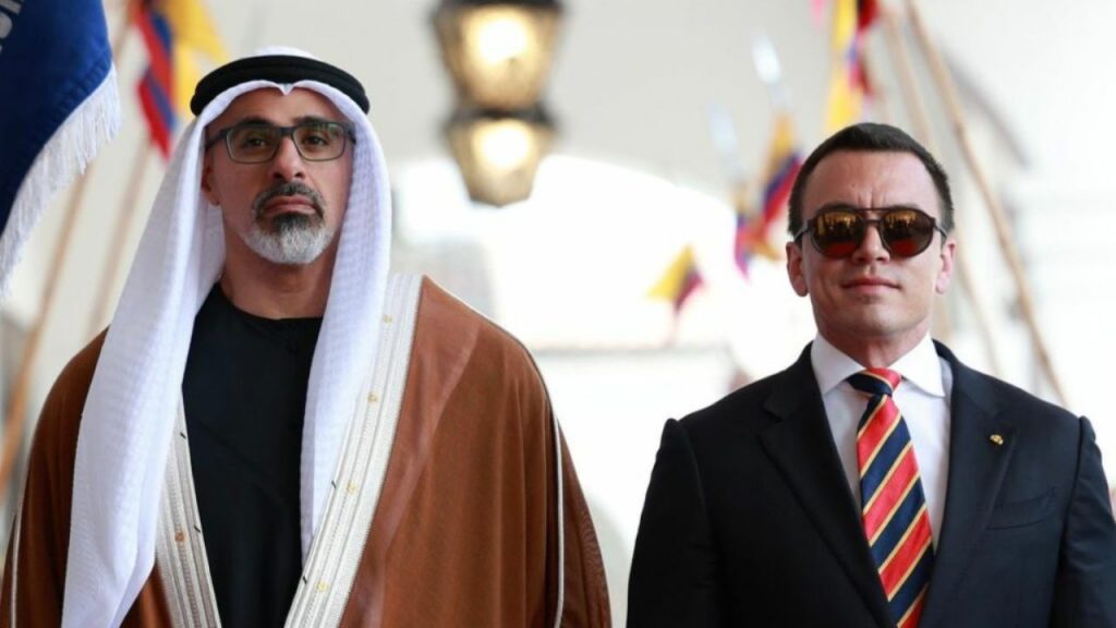 El presidente de Ecuador, Daniel Noboa, recibió este domingo 1 de marzo de 2026 en el Palacio de Carondelet, en el Centro Histórico de Quito, al príncipe heredero de Abu Dabi, Sheikh Khaled bin Mohamed bin Zayed Al Nahyan, en el marco de una visita oficial marcada por la firma de acuerdos estratégicos.