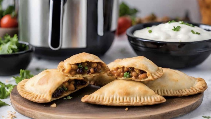Empanadillas crujientes rellenas de verduras salteadas. Perfectas como cena ligera, aperitivo o comida informal, con un resultado dorado y sin exceso de grasa gracias a la air fryer.